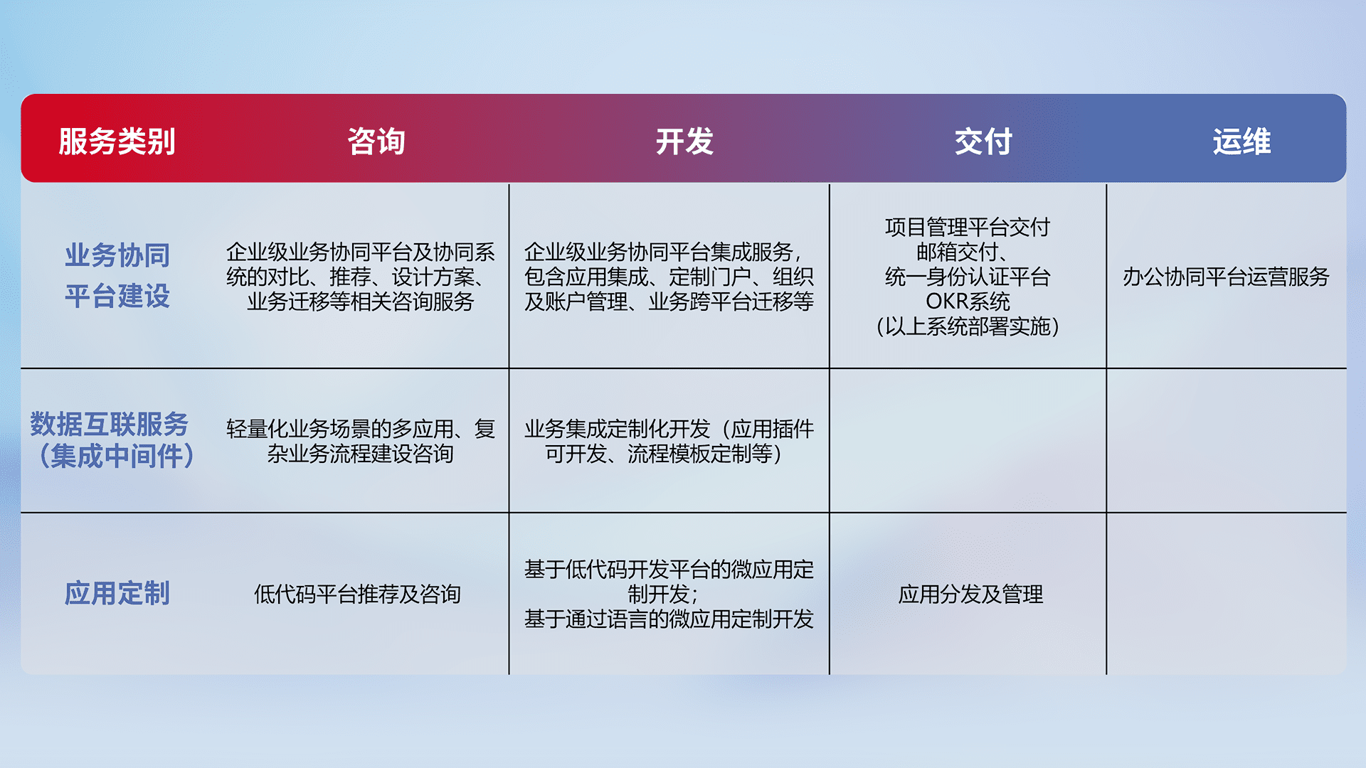 针对钉钉、、、、企微、、、IDaas等平台级产品提供产品的规划、、、、方案、、交付、、、定制化开发等服务,,,,实现如统一协同办公、、、智能客户服务、、混合会议管理、、、智能数据查询、、、等业务场景,,实现数字化转型。。。。