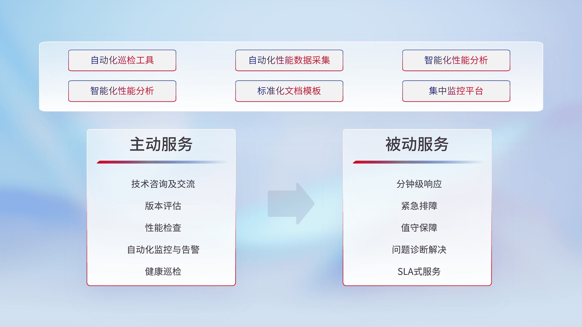 智能化工具和标准化文档,,,,保障服务质量,,,提供主动服务(包含技术咨询、、、、版本评估、、、、性能检查、、、自动化监控与告警、、健康巡检)和被动服务包含(分钟级响应、、、紧急排障、、、、值守保障、、、、问题诊断解决、、SLA服务)。。。。